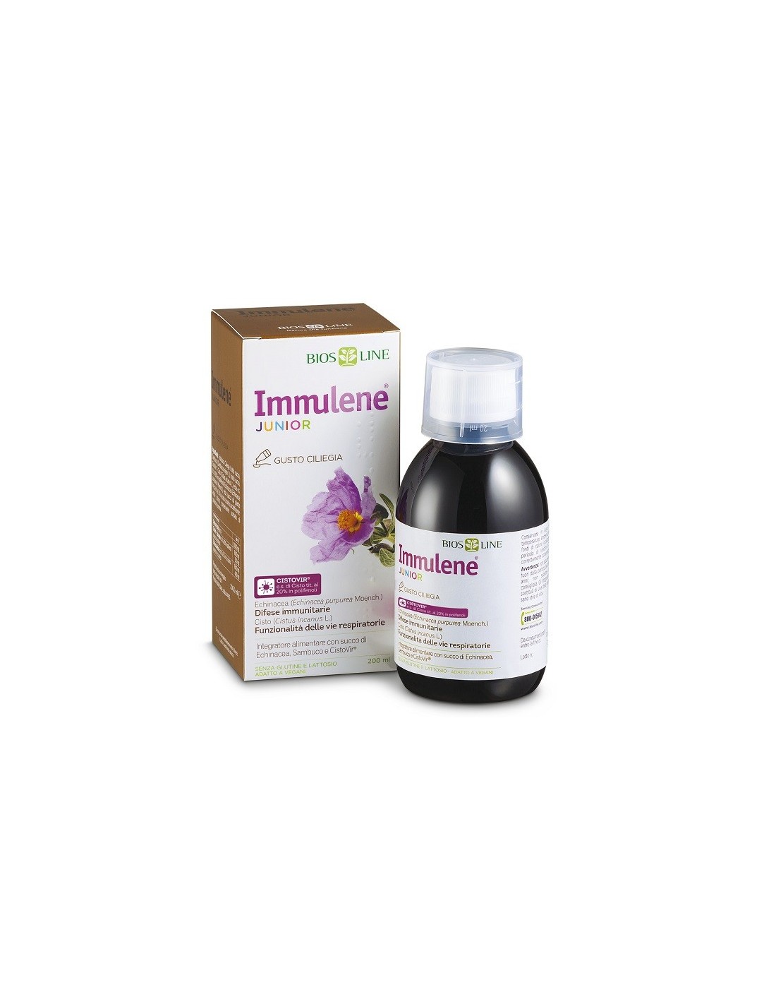Integratore alimentare a base di succo di Echinacea purpurea, succo di sambuco e CISTOVIR, estratto titolato di cisto, piccolo arbusto tipico della flora mediterranea dall'alto contenuto in polifenoli, utile per le normali funzioni delle vie respiratorie. Il succo di Echinacea purpurea, ottenuto dalla spremitura della pianta fresca, e il succo del frutto di sambuco, favoriscono la funzionalità delle vie respiratorie e del sistema immunitario. Il succo di ciliegia rende il prodotto gradevole anche per i bambini.