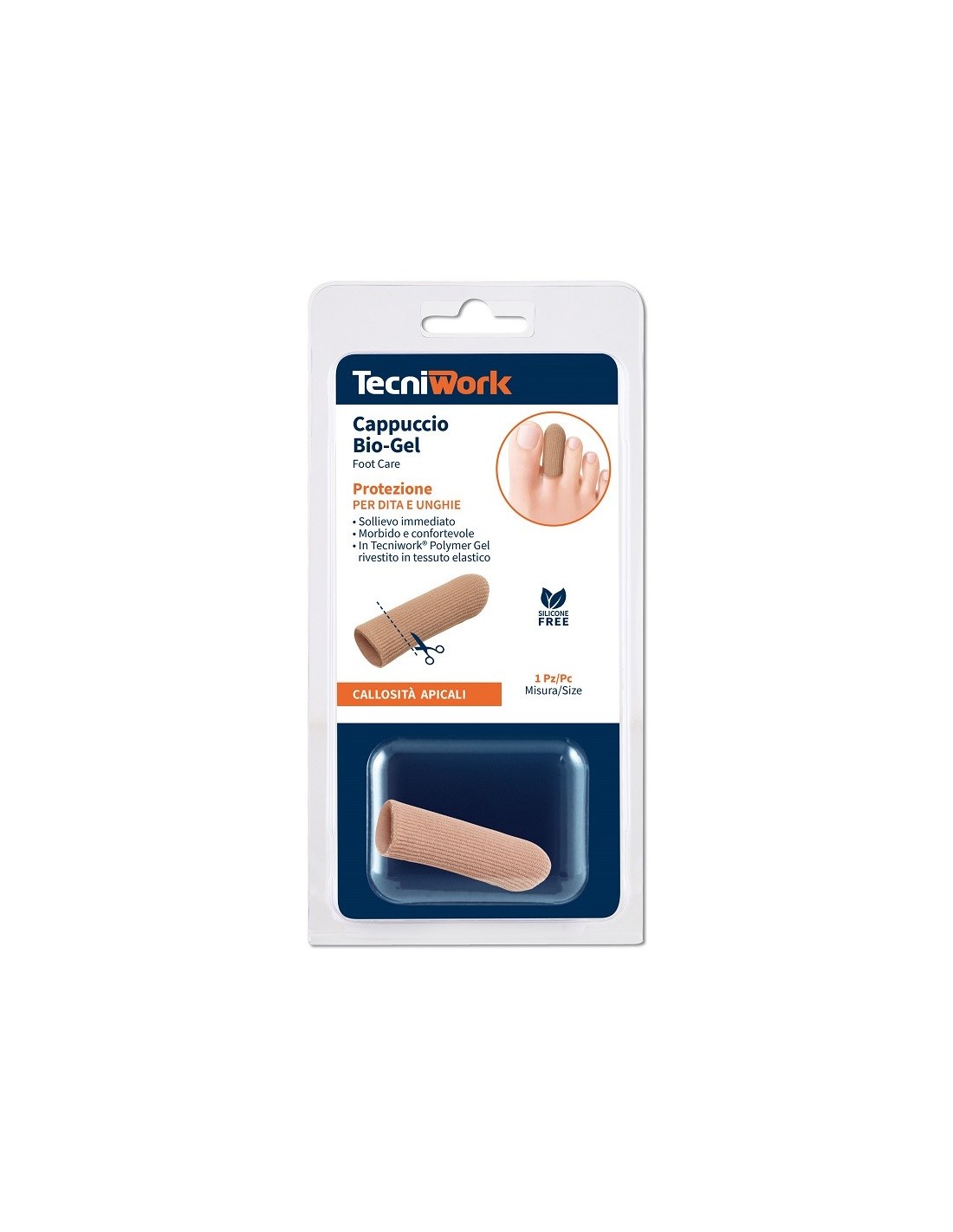 Cappuccio protettivo per dita e unghie in tessuto elastico rivestito internamente in Tecniwork Polymer Gel. Protegge la testa del dito evitando la formazione di callosità, senza creare ingombro. Evita lo sfregamento con la calzatura, previene e dona sollievo in caso di callosità e ispessimenti. Indicato anche per dita a martello, occhi di pernice, calli duri, molli, dorsali e apicali. Dispositivo medico lavabile e riutilizzabile.