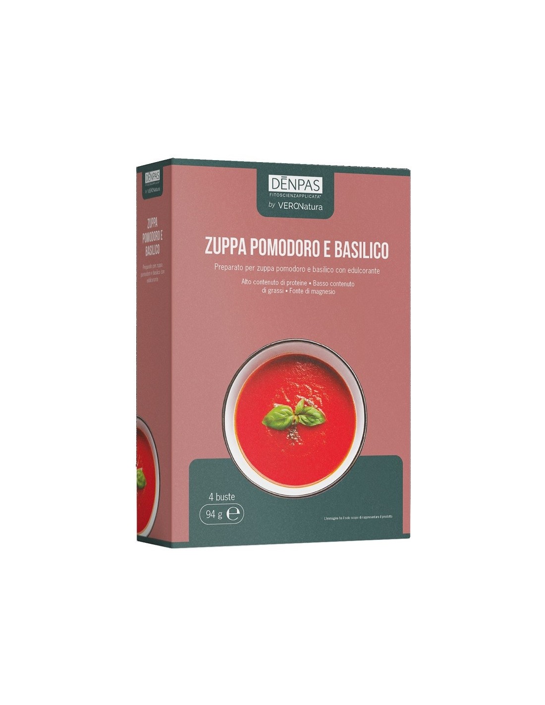 Preparato per zuppa pomodoro e basilico con edulcorante.